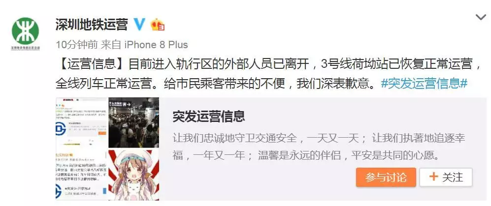 而據(jù)@深圳地鐵運(yùn)營19點(diǎn)44分消息稱,3號線荷坳站已恢復(fù)正常運(yùn)營,全線列車正常運(yùn)營。