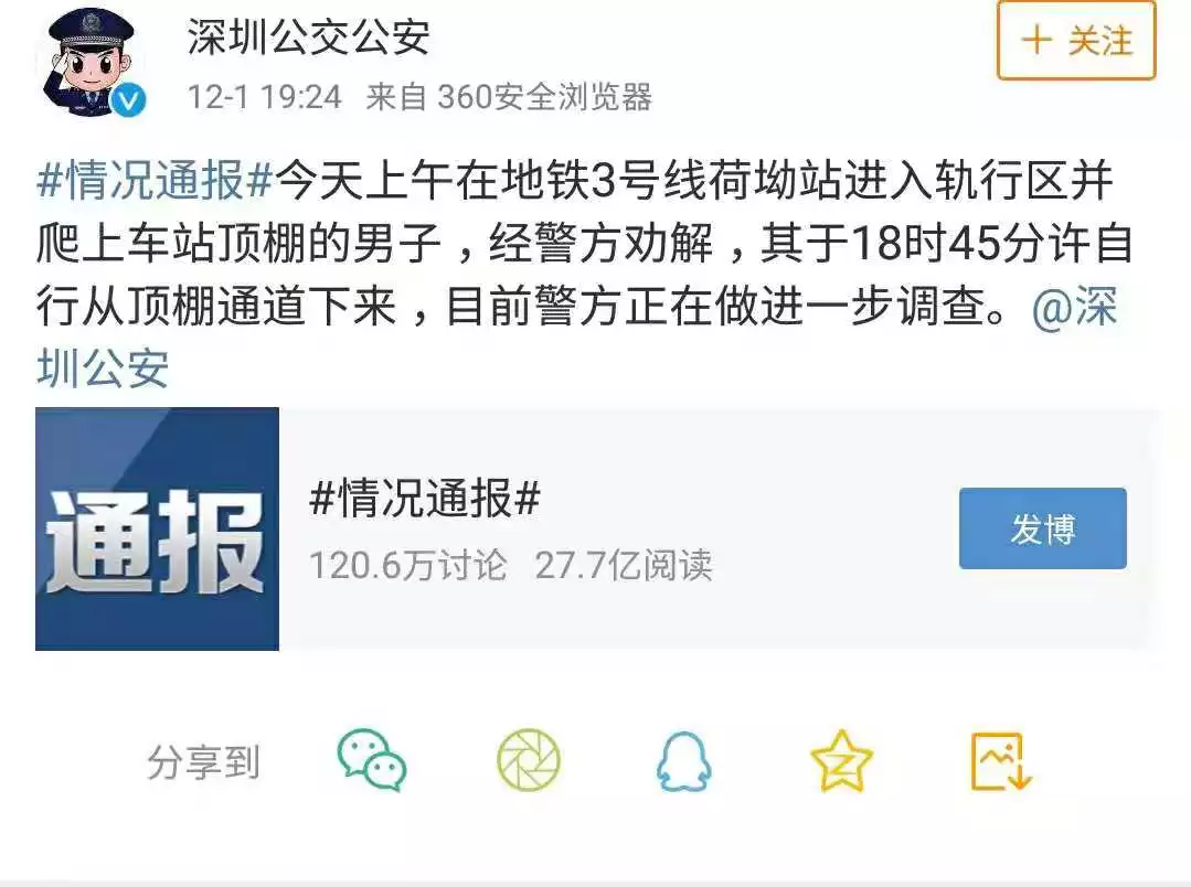 @深圳公交公安19點(diǎn)24分發(fā)布的消息,經(jīng)過深圳警方的勸解,男子自行從頂棚通道下來,目前警方正在做進(jìn)一步調(diào)查。