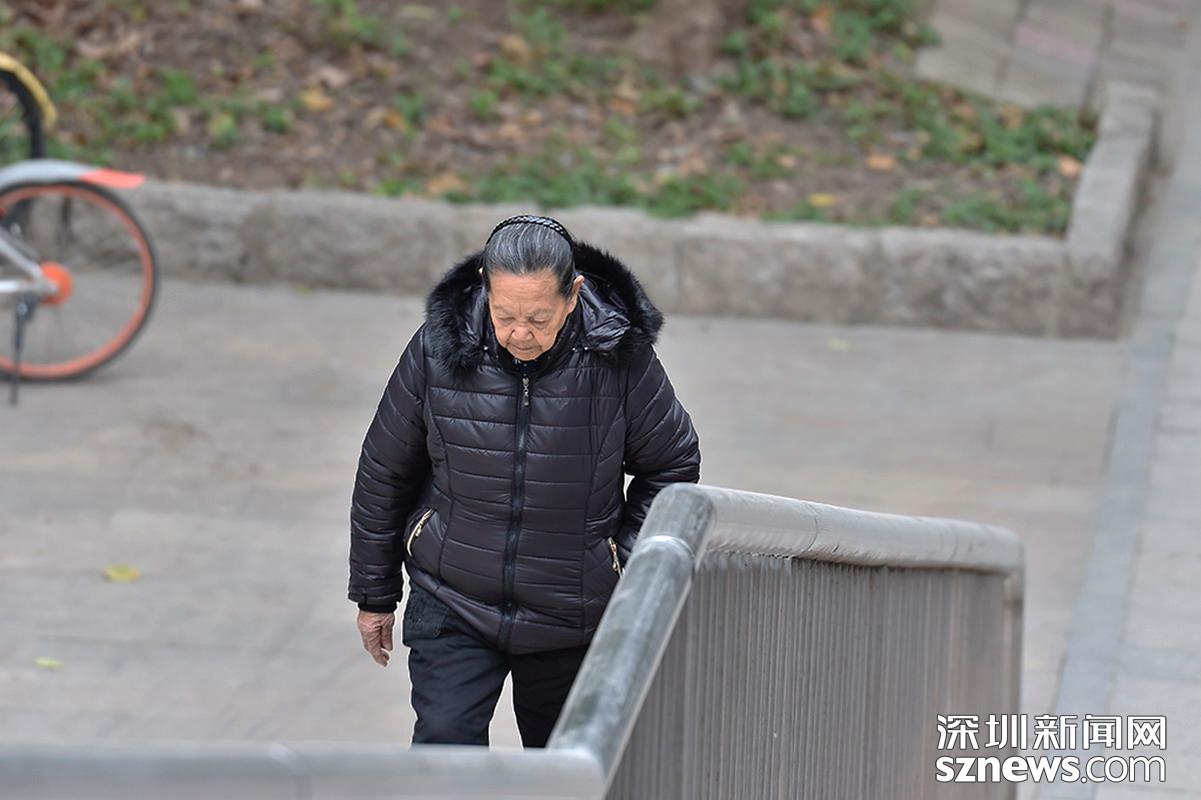 2018年12月12日,羅湖翠竹天橋,老人穿著羽絨服出行。
