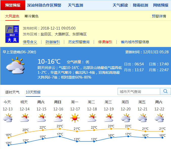 深圳新聞網(wǎng)2018年12月13日訊(記者 施冰冰)記者從深圳市氣象局獲悉,今日天氣寒冷:1多云間陰天,可見陽(yáng)光,沿海和高地最大陣風(fēng)6級(jí),氣溫11-17℃,北部及山地最低氣溫略低1℃,白天比12日溫暖;14-16日多云,可見陽(yáng)光,氣溫逐日回升;寒冷黃色預(yù)警將持續(xù)到今日,14日起氣溫回升。