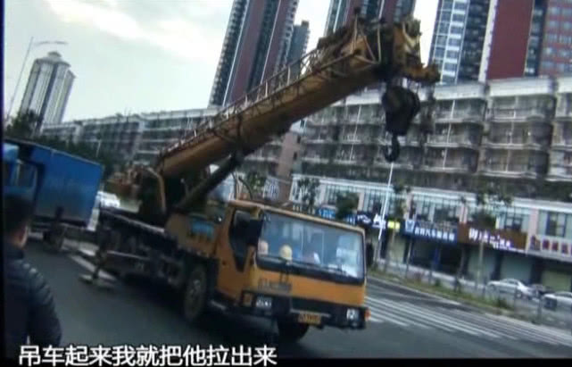 盡管大家都想盡了辦法,但貨車的重量仍然讓被壓的司機無法脫身。這時,有人看到了一部吊車經過,馬上向吊車司機求救。