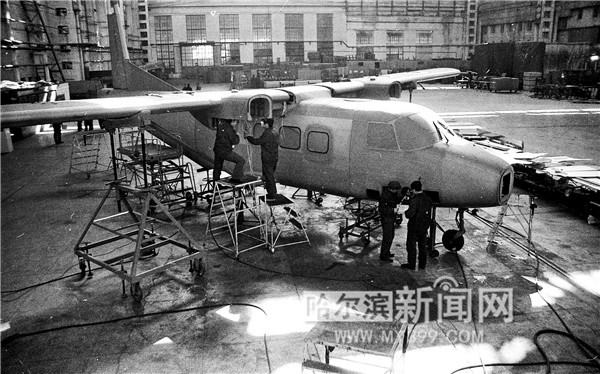 哈爾濱飛機(jī)制造公司自行研制的運(yùn)12多用途民用飛機(jī)取得了國(guó)內(nèi)首份按國(guó)際規(guī)范研制的民用飛機(jī)“型號(hào)合格證”,圖為當(dāng)年的制造車間。