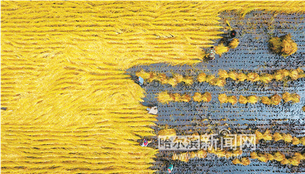 在五常營城子村一望無垠的稻田上,農(nóng)民們正在手工收割水稻。