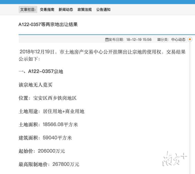 記者12月19日查閱深圳市土地房產(chǎn)交易中心官網(wǎng)信息顯示,A122—0357宗地出讓結(jié)果為無(wú)人競(jìng)買(mǎi)。