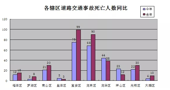 今年以來,在全市各行政區(qū)(新區(qū))中,實(shí)現(xiàn)道路交通事故死亡人數(shù)下降的有7個區(qū)。其中寶安區(qū)事故死亡人數(shù)減少24人,龍崗區(qū)事故死亡人數(shù)減少22人,這兩個我市傳統(tǒng)的事故多發(fā)區(qū)事故死亡人數(shù)下降數(shù)占全市事故死亡人數(shù)下降總?cè)藬?shù)的79.31%。