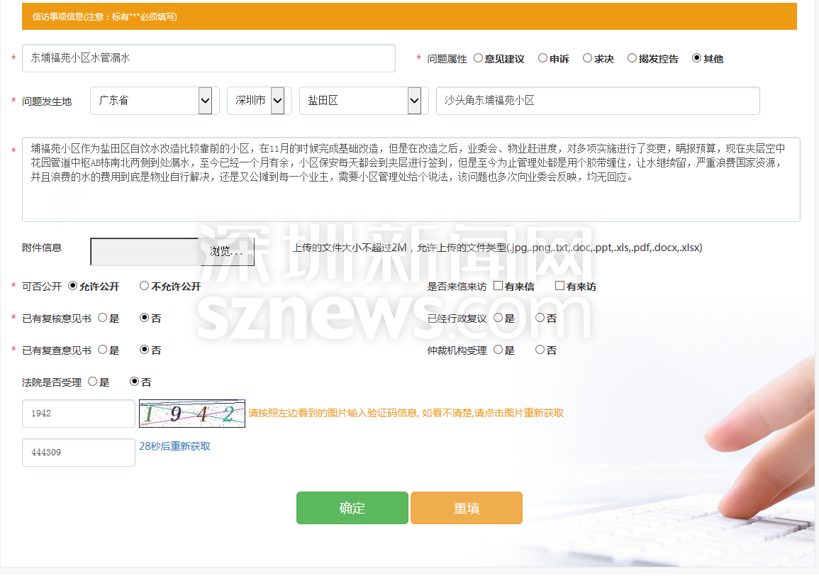 為核實(shí)網(wǎng)友反映情況,記者隨即登錄該網(wǎng)站,點(diǎn)擊“我要寫信”后,便跳轉(zhuǎn)到寫信填表頁面,填寫完基本信息,點(diǎn)擊確認(rèn),顯示“投信成功”。經(jīng)測試,記者并未看到該網(wǎng)友反映的“添加失敗”情況。但從網(wǎng)帖上看,該網(wǎng)友仍對自己投訴無門的遭遇感到糟心,他堅(jiān)持表示自己手上有水管漏水以來近一個(gè)月的照片和視頻,自己反映的情況也絕對屬實(shí),希望有關(guān)部門能給一個(gè)答復(fù)。