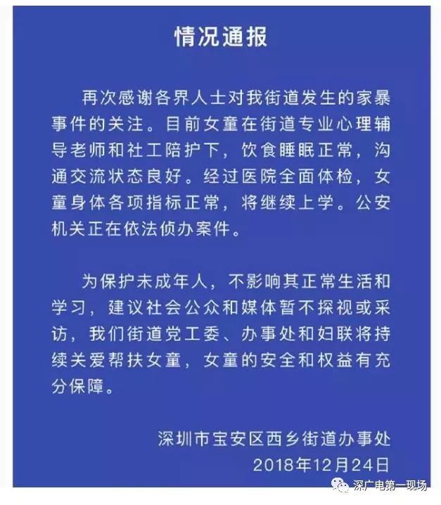 12月24日晚,深圳市寶安區(qū)西鄉(xiāng)街道辦通報(bào)表示:目前女童在街道專業(yè)心理輔導(dǎo)老師和社工陪護(hù)下,飲食睡眠正常,溝通交流狀態(tài)良好。經(jīng)過醫(yī)院全面體檢,女童身體各項(xiàng)指標(biāo)正常,將繼續(xù)上學(xué)。