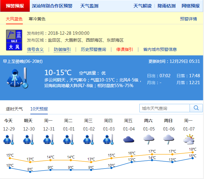 深圳新聞網2018年12月29日訊(記者 陳婕)深圳市氣象局預計,29日-元月3日受冷空氣持續(xù)影響,氣溫顯著下降,天氣持續(xù)寒冷,最低氣溫將降至7-8℃,沿海和高地有7-9級偏北大風,間中有小雨。寒冷天氣將持續(xù)6天左右。
