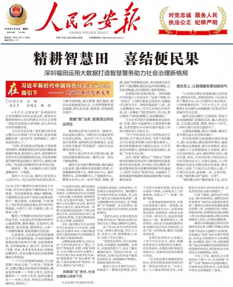 ★★進(jìn)入新時代,福田公安用信息化手段不斷強(qiáng)化管理、創(chuàng)新服務(wù)、提升效能,一件事情接著一件事情辦,不斷滿足群眾最關(guān)心最直接最現(xiàn)實(shí)的需求,讓數(shù)據(jù)多跑腿、群眾少跑路,打通服務(wù)群眾的“最后一公里”。