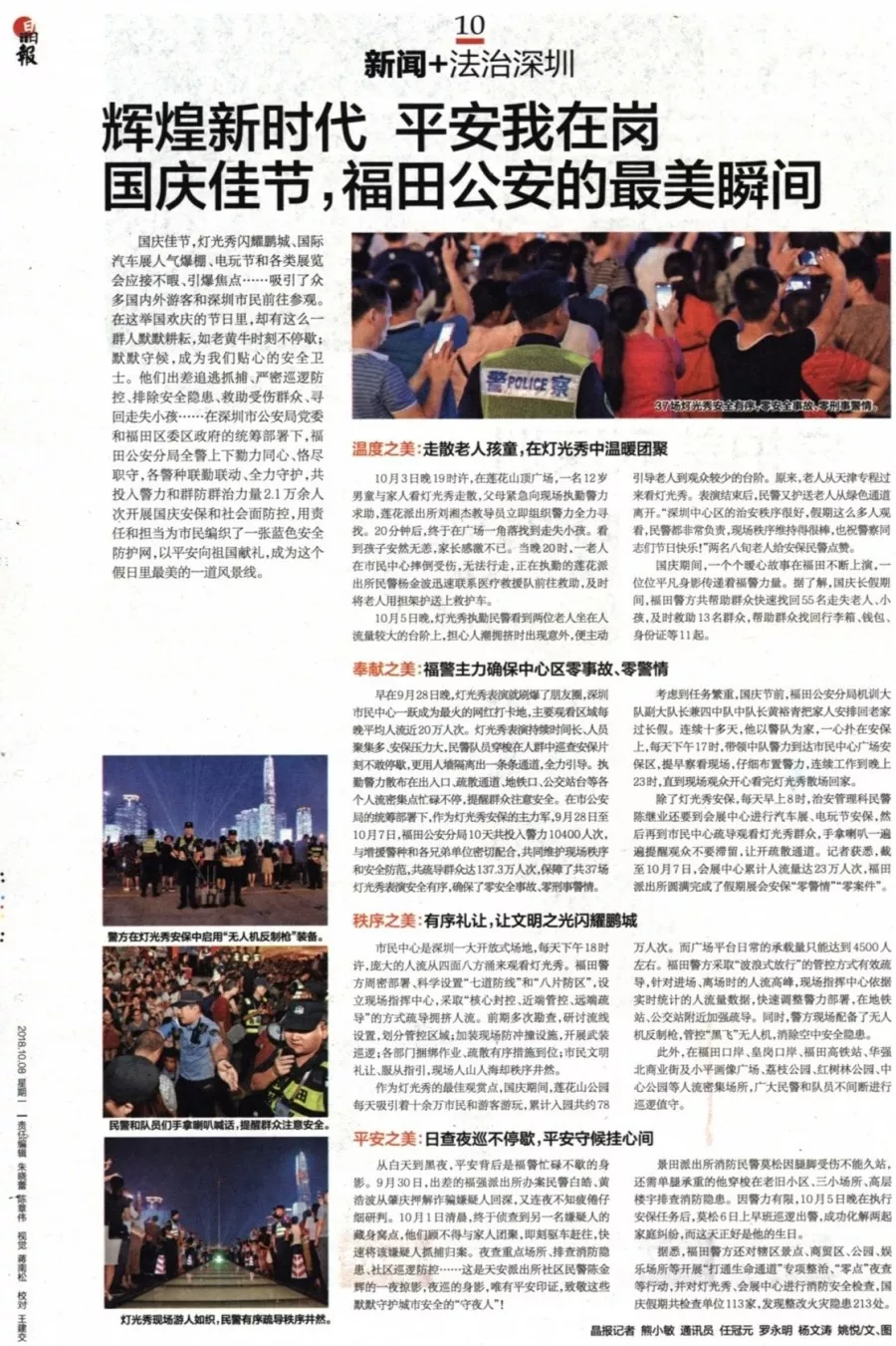 ★★深圳燈光秀表演持續(xù)時間長,每晚平均人流近20萬人次,安保工作強度大。福田分局參與安保工作的警力堅守崗位,維護(hù)現(xiàn)場秩序,在各個出入口、疏散通道、地鐵口、公交站臺等人流密集點都能看到他們忙碌的身影。