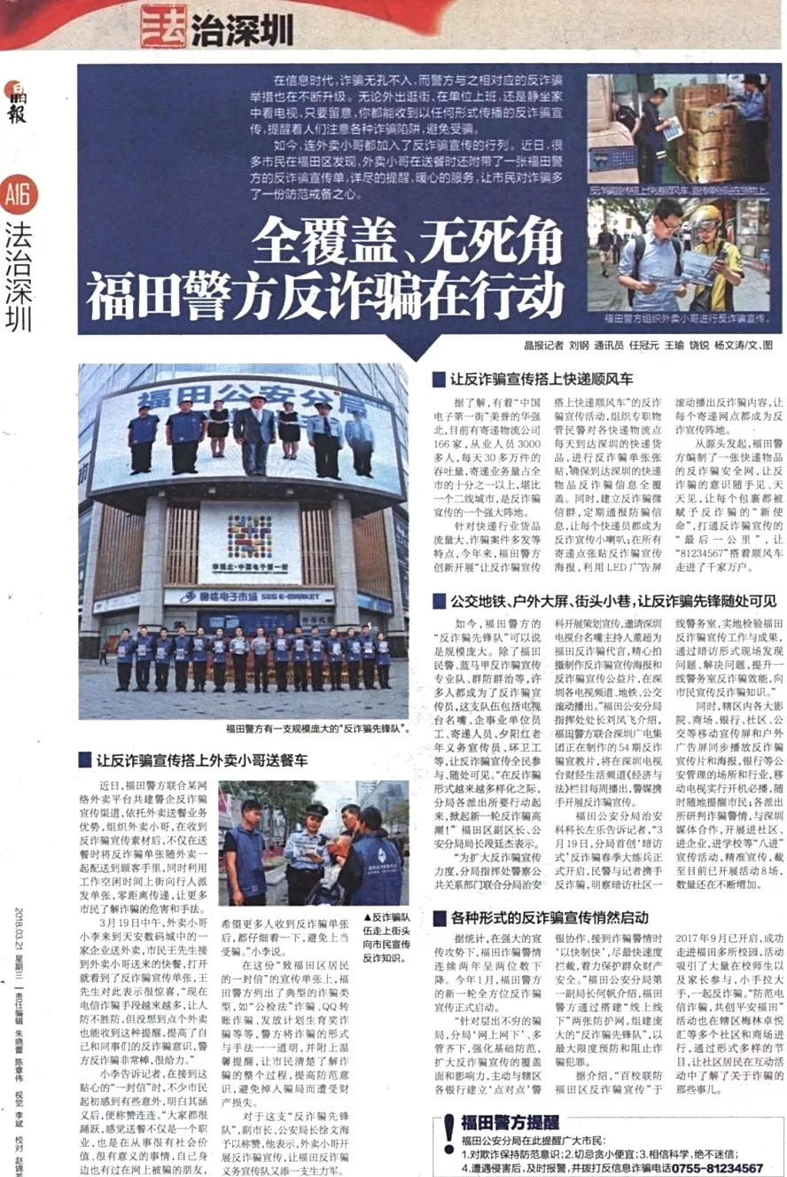★★福田警方通過搭建“線上線下”兩張防護(hù)網(wǎng),組建龐大的“反詐騙先鋒隊”,多管齊下,擴大反詐騙宣傳的覆蓋面和影響力,最大限度預(yù)防和阻止詐騙犯罪。