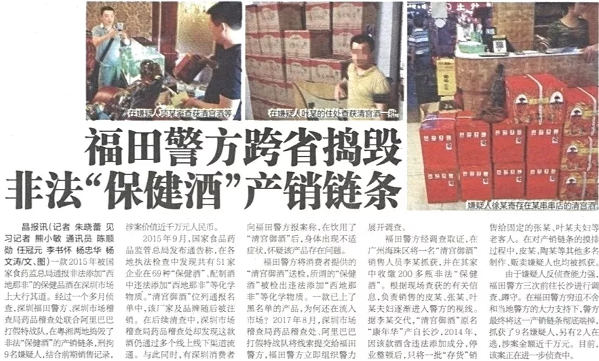 ★★福田警方聯(lián)合深圳市場(chǎng)稽查局藥品稽查處,在阿里巴巴“打假特戰(zhàn)隊(duì)”協(xié)助下,經(jīng)過(guò)一個(gè)多月偵查,于粵湘兩地?fù)v毀了非法“保健酒”的產(chǎn)銷鏈條,刑拘9名嫌疑人,涉案價(jià)值近千萬(wàn)元人民幣。