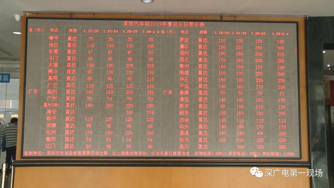 在車站售票廳的票價(jià)顯示屏,不停地滾動春運(yùn)期間車站所有線路的票價(jià),均比平時(shí)的票價(jià)有所上浮,但均在上限票價(jià)之內(nèi)。