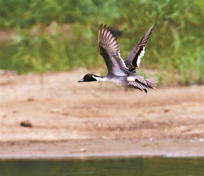 一只針尾鴨飛過3號魚塘上空。