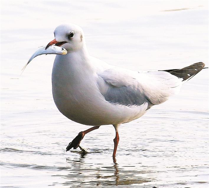再往東去,便是深圳河入???這里也是深圳河與新洲河的交匯處。在這里,除了5只黑臉琵鷺正在河口覓食,河面上還聚集著上千只紅嘴鷗。每當疏浚河道的船只駛過,紅嘴鷗就成群結隊地尾隨著船只的航跡,捕食被船槳翻到水面上的魚蝦。