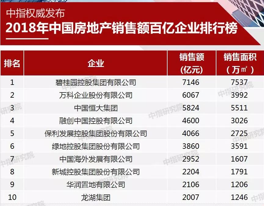 深圳新聞網(wǎng)2019年1月1日訊(記者 何暢)近日,中指研究院發(fā)布2018年中國(guó)房地產(chǎn)銷售額百億企業(yè)排行榜,2018年銷售金額TOP100的位次爭(zhēng)奪終于落下帷幕,碧桂園以7000億元再次位列榜首,萬科和恒大分居亞軍、季軍。