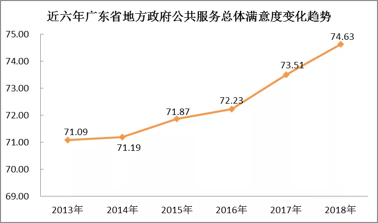 深圳新聞網(wǎng)2019年1月3日訊 近日,廣東省省情調(diào)查研究中心、廣東省社會科學(xué)院績效評估中心公布了《2018年廣東省地方服務(wù)型政府建設(shè)系列調(diào)研報(bào)告》(以下簡稱“報(bào)告”),今年該調(diào)研根據(jù)“公共服務(wù)”和“營商環(huán)境”雙向維度,由“廣東省地方政府公共服務(wù)公眾評價(jià)調(diào)查”和“廣東省營商環(huán)境公眾滿意度調(diào)查”兩個(gè)調(diào)查組成。今年調(diào)查共回收有效問卷28156份,結(jié)果顯示:2018年廣東省地方政府公共服務(wù)總體滿意度得分為74.63分,較去年提高1.12分,創(chuàng)十年來最高水平。