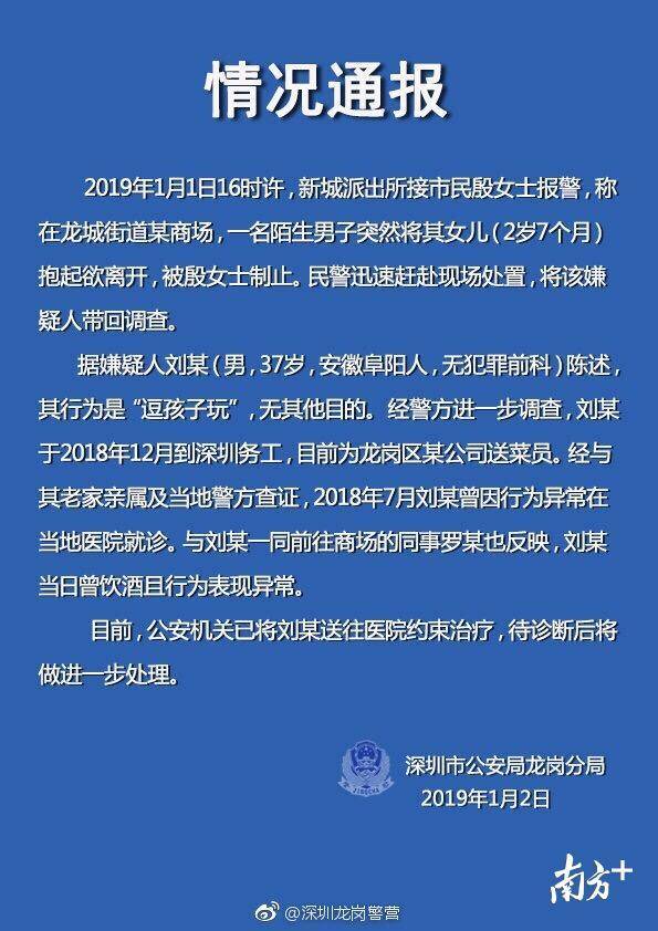 1月2日,深圳市公安局龍崗分局發(fā)布情況通報稱:已將劉某送往醫(yī)院約束治療,待診斷后將做進(jìn)一步處理。