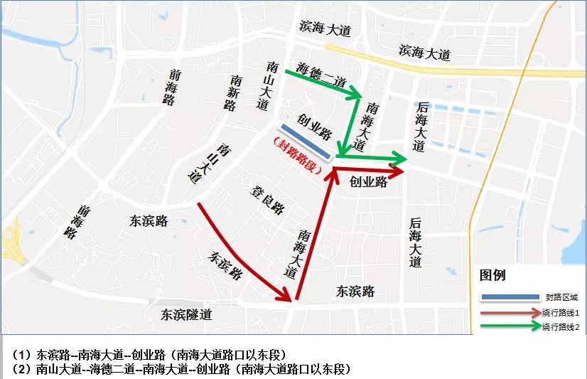 原經南山大道轉入創(chuàng)業(yè)路東行,前往創(chuàng)業(yè)路(南海大道路口以東段)的,可按以下路線通行:
