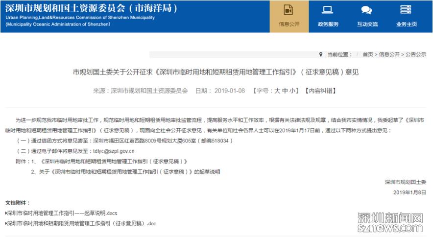 深圳新聞網(wǎng)2019年1月8日訊(記者 潘潤(rùn)華)1月8日,市規(guī)土委起草發(fā)布《深圳市臨時(shí)用地和短期租賃用地管理工作指引(征求意見(jiàn)稿)》(以下簡(jiǎn)稱(chēng)“征求意見(jiàn)”)。根據(jù)該征求意見(jiàn),社會(huì)投資主體組織實(shí)施的急需公共服務(wù)設(shè)施用地為短期租賃用地,需按照我市地價(jià)測(cè)算相關(guān)規(guī)則繳交租金。