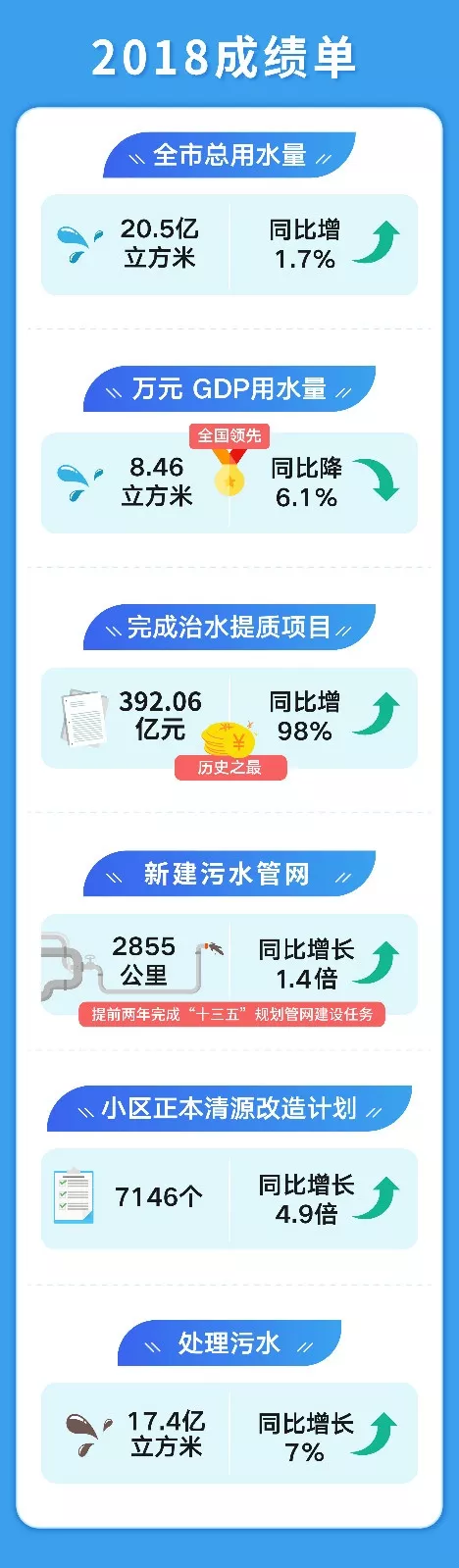 我們加快健全治污基礎(chǔ)設(shè)施體系,污水日均處理量504.14萬立方米,污水處理率達(dá)97%!新增污水處理能力66萬噸/日,完成提標(biāo)281萬噸/日,總處理能力達(dá)622.5萬噸/日,基本實現(xiàn)污水全收集、全處理。