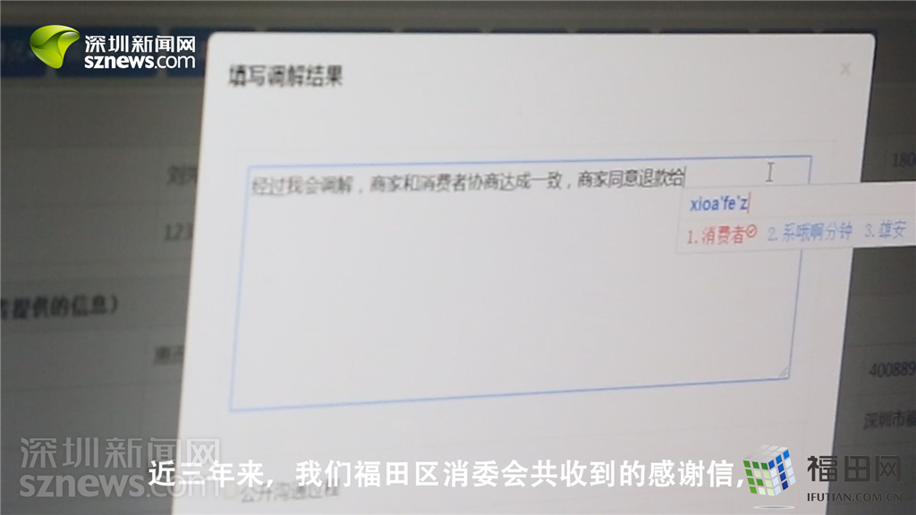福田區(qū)消委會工作人員在315投訴平臺上填寫調(diào)解結(jié)果。