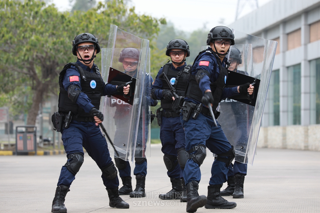 隊列會操步履整齊劃一,動作規(guī)范有力,擒敵拳演練虎虎生威,遒勁剛猛,展現(xiàn)了深圳監(jiān)獄警察訓練有素、團結一致的團隊風采。特警隊員壓軸表演的警棍盾牌操,動作迅速,合作默契,彰顯深圳監(jiān)獄警察過硬的專業(yè)本領和團結協(xié)作的團隊精神。值得一提的是,在9個隊列中,有1個隊列全部由女警組成,她們聲音洪亮,英姿颯爽,巾幗不讓須眉,是深圳監(jiān)獄警察團隊中一道亮麗的風景。