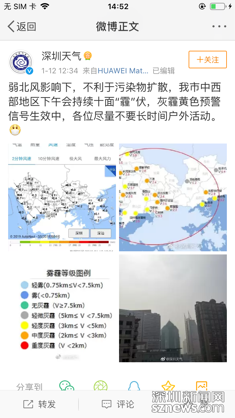 1月12日中午,深圳天氣微博發(fā)布預(yù)警,圖中橙色圓點(diǎn)所在的深圳多個(gè)片區(qū)發(fā)生中度灰霾