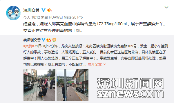 深圳一跑車沖向人行道致1死5傷 肇事司機(jī)嚴(yán)重醉駕
