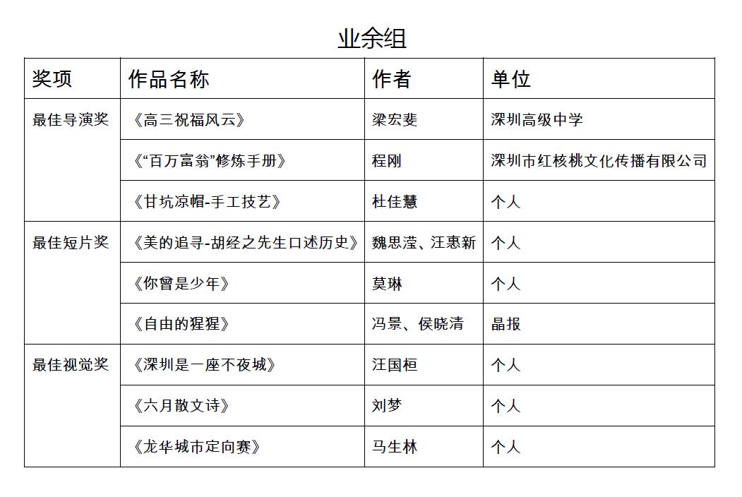 作為創(chuàng)意12月活動的重頭項目,本次視頻大賽由深圳報業(yè)集團、深圳市網絡媒體協(xié)會主辦,深圳新聞網、深圳市中影南方廣告有限公司、深圳市上御同禧文化傳播有限公司承辦,面向社會共征集到視頻作品500余部。大賽組委會邀請了專業(yè)媒體人士和影視大咖擔任評委,共有70件作品入圍終評會,經過組委會辦公室的最終評選,最終確定了獲獎作品。參加比賽的,既有新聞媒體界和廣告公司的專業(yè)人士,也有各行各業(yè)熱愛視頻拍攝制作的“發(fā)燒友”,參賽作品題材廣泛,既有記錄深圳城市風貌的視覺大片,也不乏故事性強、拍攝剪輯手法新穎、主題立意深刻的作品。