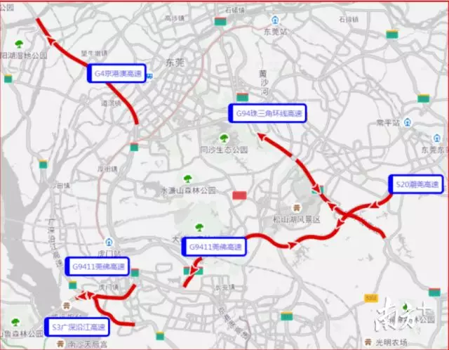 建議途經(jīng)廣深高速公路由深圳往廣州方向(北行)的車輛,在北行長(zhǎng)安出口、虎門出口繞行國(guó)道或轉(zhuǎn)到常虎高速公路到廣州。