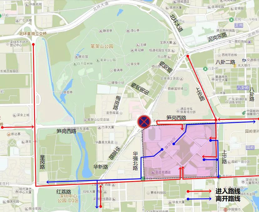 車行交通調(diào)整為:筍崗西路 -梅崗路;紅荔路 -皇崗路 -筍崗西路 -梅崗路;筍崗西路 -泥崗西路 -靜逸街(梅崗南街)。