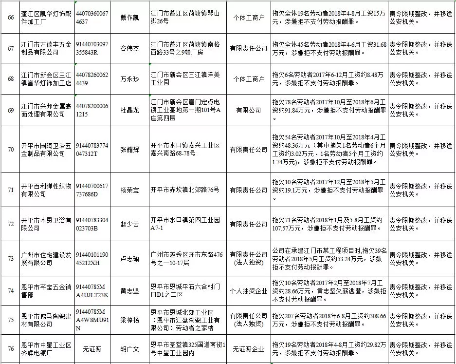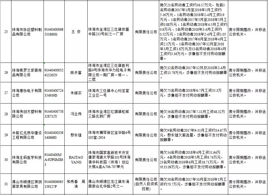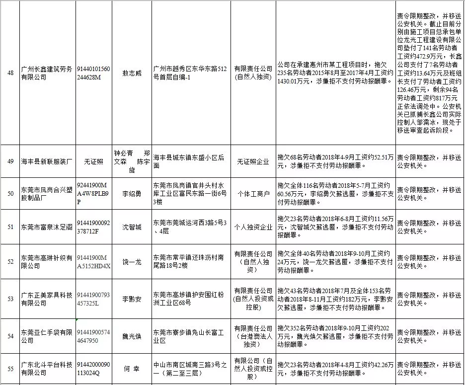 深圳新聞網(wǎng)2019年1月29日訊 (記者 劉婷)據(jù)廣東發(fā)布消息,省人社廳近日公布,2019年第一批用人單位重大勞動保障違法行為名單。到底是哪些企業(yè)在惡意欠薪?這些“老賴”企業(yè)的營業(yè)執(zhí)照、地址、法人等等超全信息都在這!