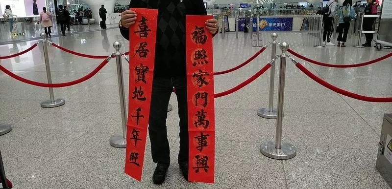 宋先生當天10:50的飛機出發(fā)去上海再轉(zhuǎn)機回老家山東,他選擇了“人和家順百事興,富貴平安福滿堂”橫批“家和業(yè)興”,一個個“家”“安”“和”等字樣表達了他的新年愿望:希望家人平平安安。