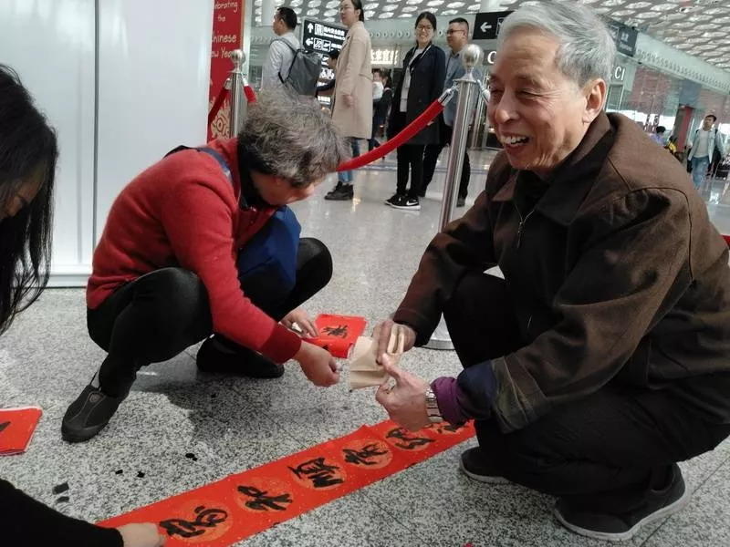 來領春聯(lián)的旅客里有國內輾轉回老家的,有回國過年的,也有特地去國外過年的。來自江西婺源的曾老先生11點多的飛機飛往馬來西亞,今年他和老伴、孩子將在馬來西亞過年。他選的這兩幅春聯(lián)是他對新年的希望與祝福,將帶到馬來西亞貼起來,給新年增添年味兒?!拔疫€可以送給朋友,這是最好的禮物,他們一定會喜歡的?!痹壬吲d地說。