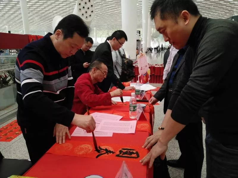 ▲旅客們請書法家們寫春聯(lián),把“?!睅Щ丶?