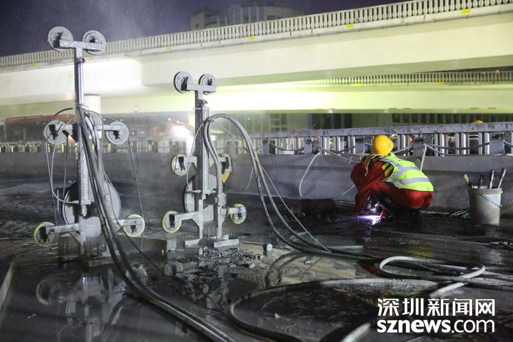 工人正對橋體進(jìn)行繩鋸切割。