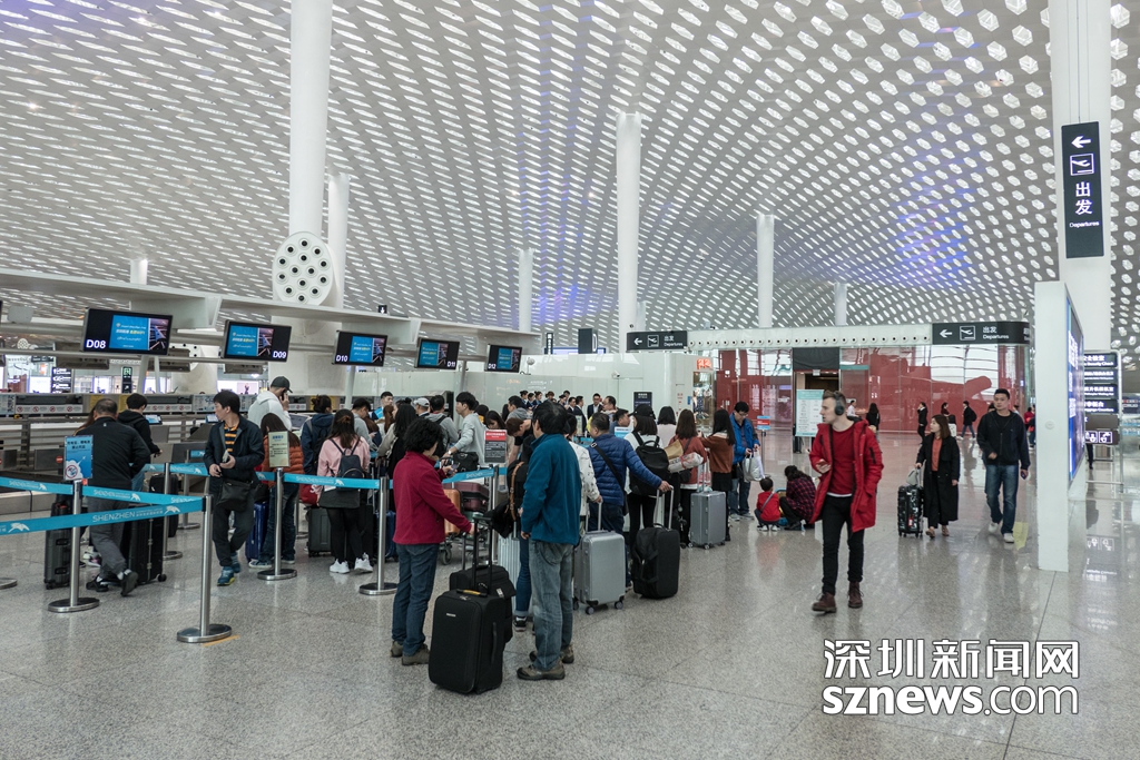 2月3日10:15,寶安機場出發(fā)大廳,旅客正在辦理行李托運手續(xù)(實習(xí) 生關(guān)天宇攝)