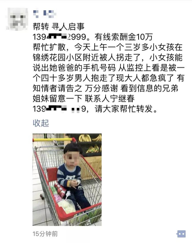 深圳晚報2019年2月13日訊 2月10日晚間一則內(nèi)容為"家長懸賞10萬元尋找3歲被拐女孩"的消息,刷爆了很多網(wǎng)友的微信朋友圈。"幫忙擴散,3歲女孩在錦繡花園小區(qū)被拐走,家長拿出10萬元酬金尋人……"網(wǎng)友紛紛傳遞愛心的同時,也在為女孩的安危捏著一把汗。然而,記者調(diào)查發(fā)現(xiàn)實際情況卻并非如此......