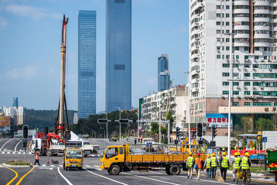 記者在現(xiàn)場(chǎng)看到吊車(chē)正在調(diào)運(yùn)施工物資。
