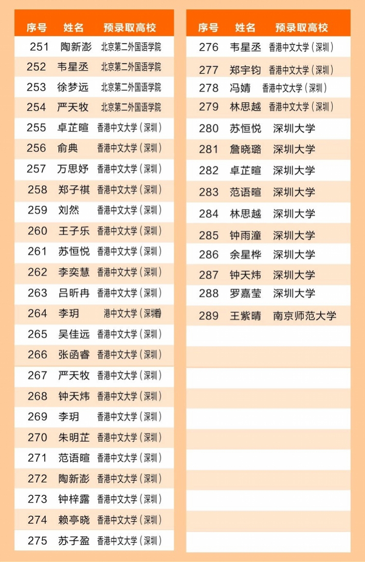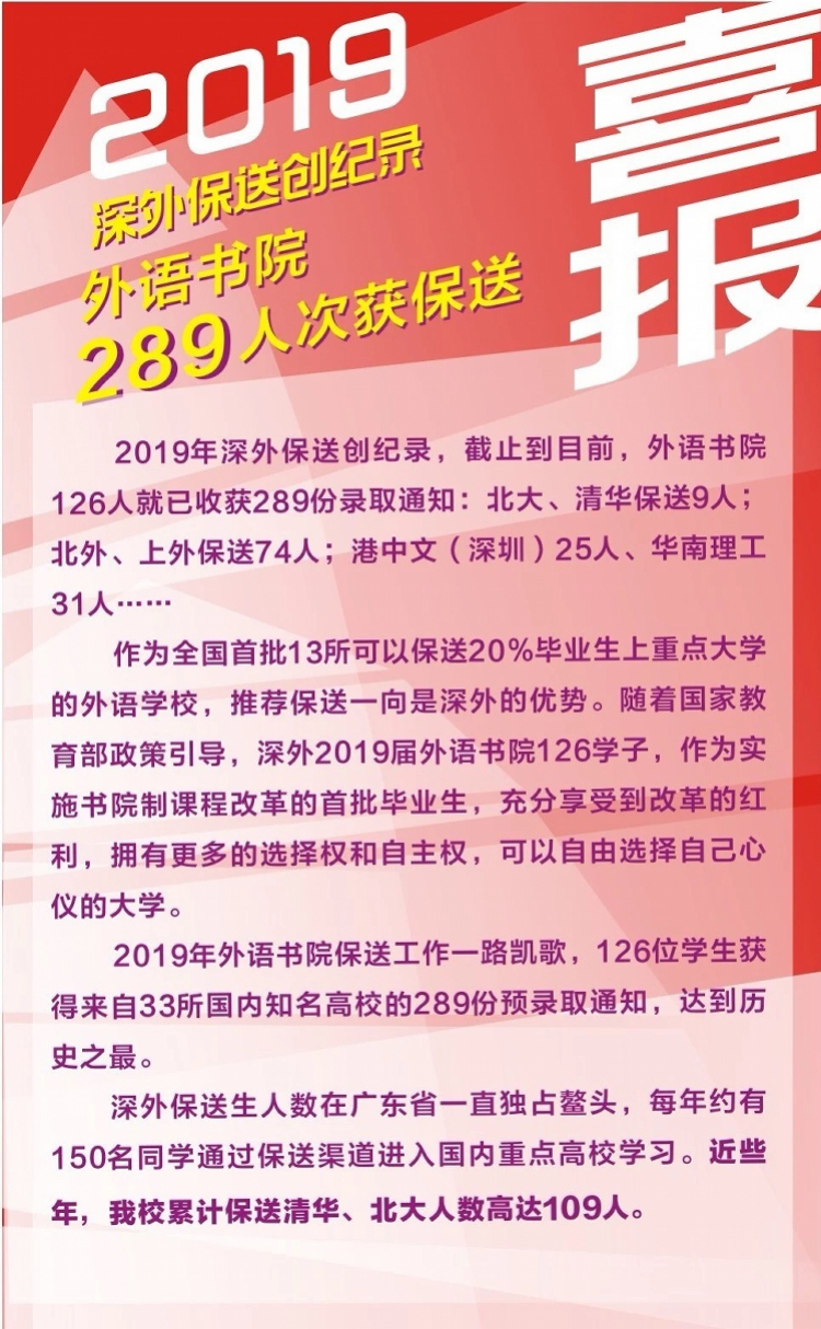 深圳晚報(bào)2019年02月17日訊 2月16日,記者從深圳外國語學(xué)校獲悉,該校2019年保送創(chuàng)紀(jì)錄。截至目前,該校外語書院126人收獲289份預(yù)錄取通知,其中北京大學(xué)、清華大學(xué)保送9人;北京外國語大學(xué)、上海外國語大學(xué)保送74人;香港中文大學(xué)(深圳)25人、華南理工大學(xué)31人……
