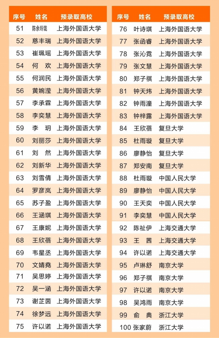 2019屆外語書院保送工作一路凱歌,除8人尚未考試外,126位學(xué)生已獲得來自33所國內(nèi)知名高校的289份預(yù)錄取通知,達(dá)到歷史之最。其中:北京大學(xué)7人,清華大學(xué)2人,浙江大學(xué)4人,上海交通大學(xué)3人,復(fù)旦大學(xué)4人,中國人民大學(xué)4人,南京大學(xué)4人,北京外國語大學(xué)40人,上海外國語大學(xué)34人,華南理工大學(xué)31人。復(fù)旦大學(xué)、南京大學(xué)、北京外國語大學(xué)、上海外國語大學(xué)、華南理工大學(xué)等均創(chuàng)深外外語類保送預(yù)錄取人數(shù)的歷史紀(jì)錄。南京大學(xué)、中山大學(xué)、北京理工大學(xué)、北京語言大學(xué)、大連理工大學(xué)、重慶大學(xué)、天津大學(xué)、深圳大學(xué)、北京第二外國語學(xué)院等預(yù)錄取率達(dá)100%。