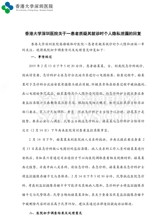接到投訴后的港大深圳醫(yī)院,作出了以下回應: