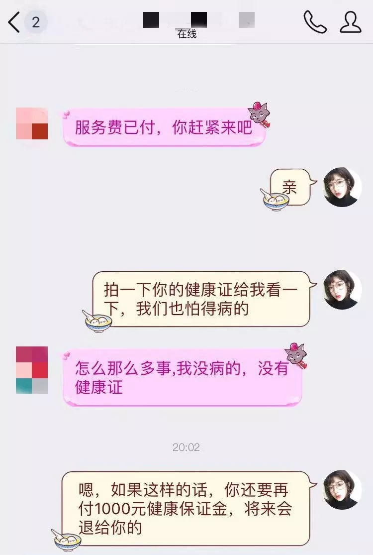 轉(zhuǎn)賬后,小李同學(xué)到一酒店開好房間,靜等“小妹”上門,但此時,對方要求再交1000元“風(fēng)險押金”才能安排“小妹”過來。