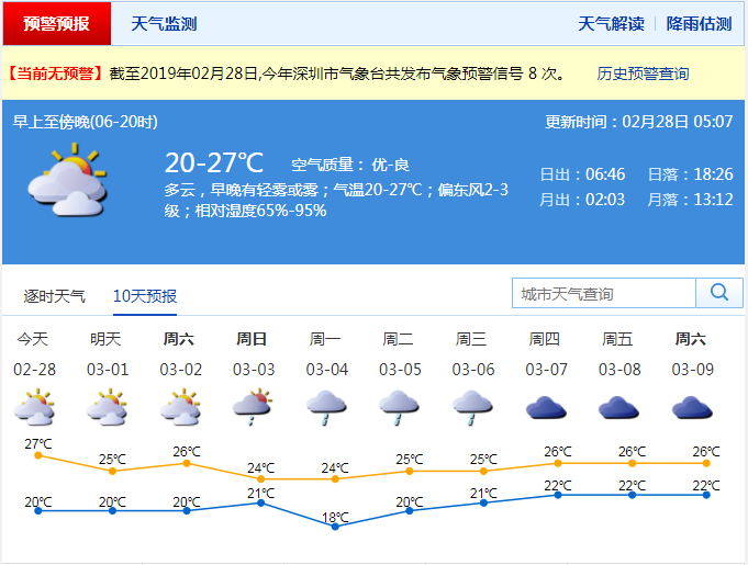 未來(lái)三天深圳天氣以多云為主 溫暖潮濕 今日最高溫達(dá)27℃
