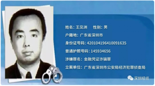犯罪嫌疑人姓名:王見洲,男,1964年10月9日生,漢族,籍貫湖北省武漢市,戶籍地廣東省深圳市,身份證號(hào)碼:420104196410091635,普通護(hù)照號(hào)碼:145934656,原中國工商銀行深圳分行紅圍支行泥崗辦事處副主任。因涉嫌金融憑證詐騙罪于1998年12月潛逃出境。國際刑警組織于2016年11月14日對(duì)王見洲發(fā)布紅色通報(bào)。