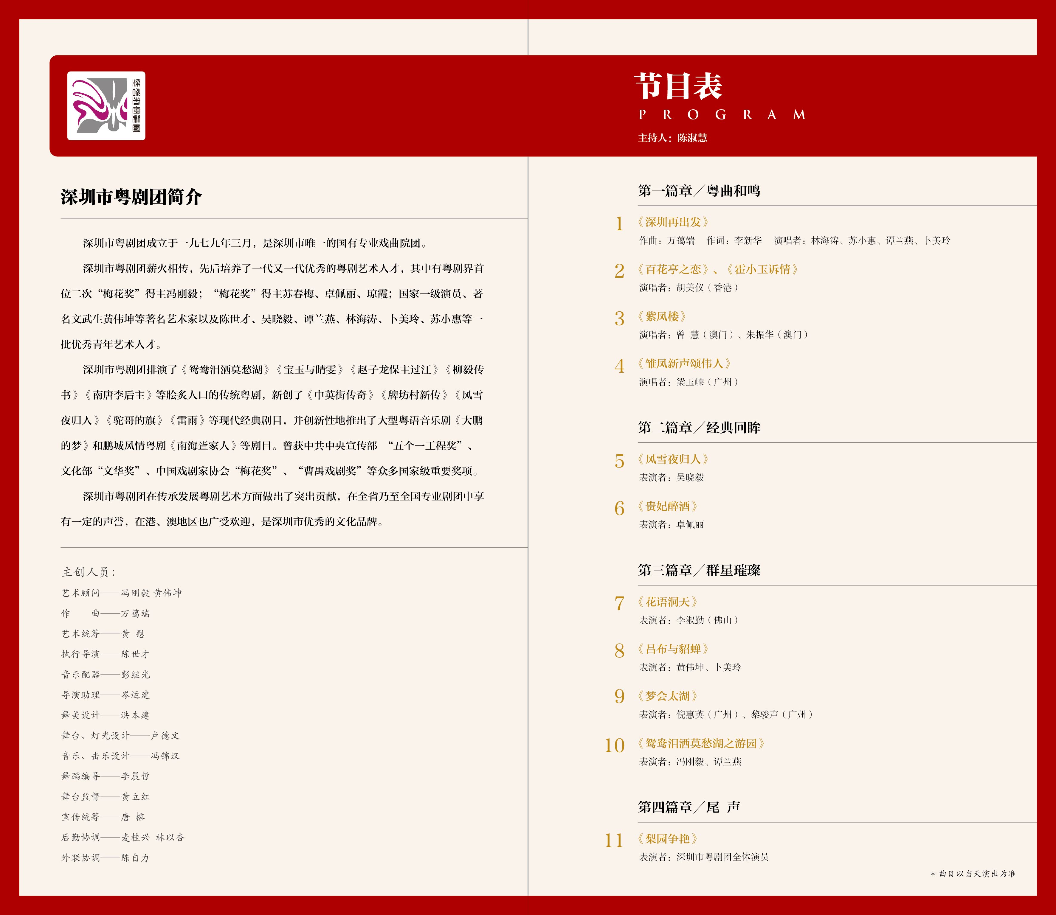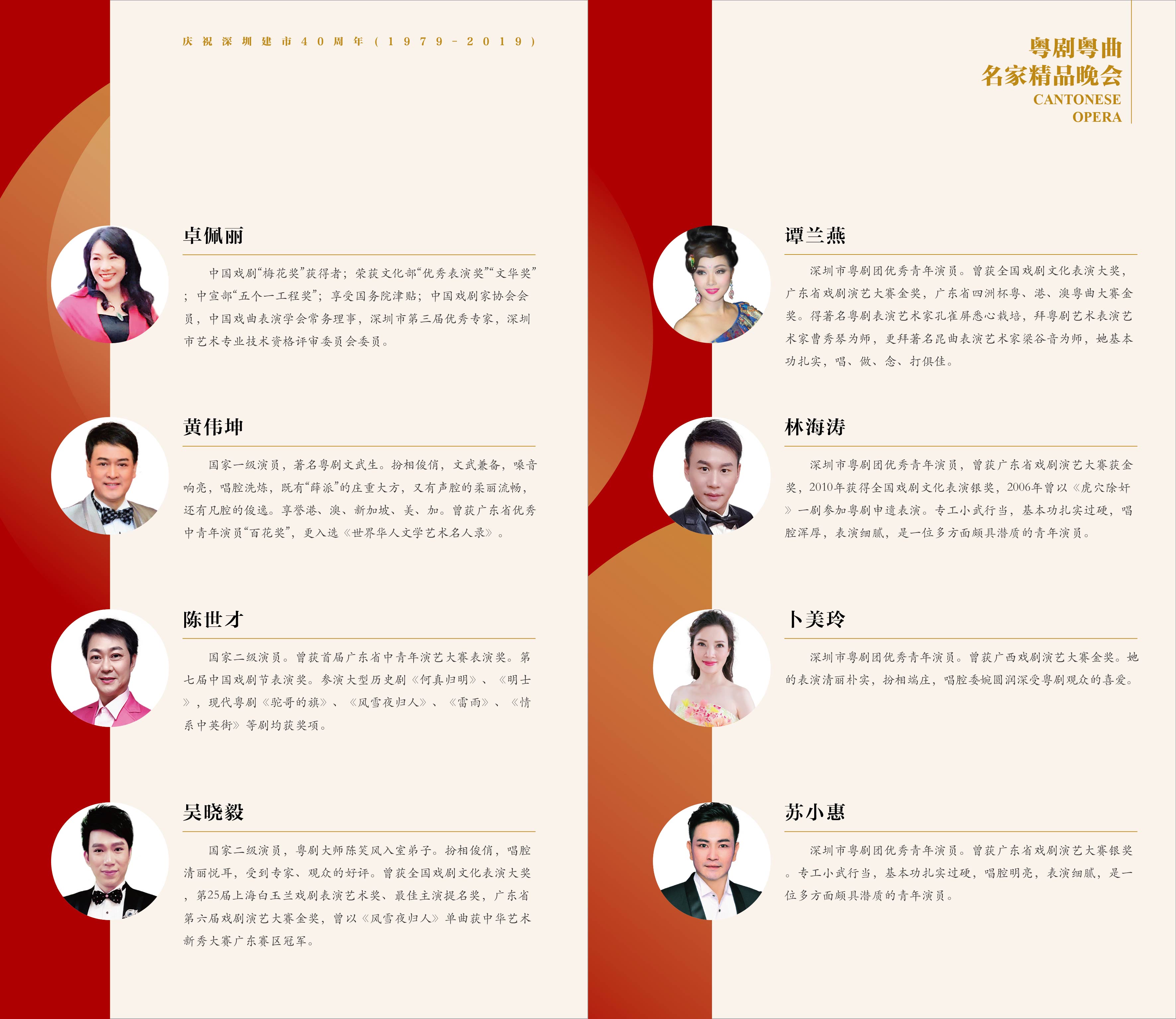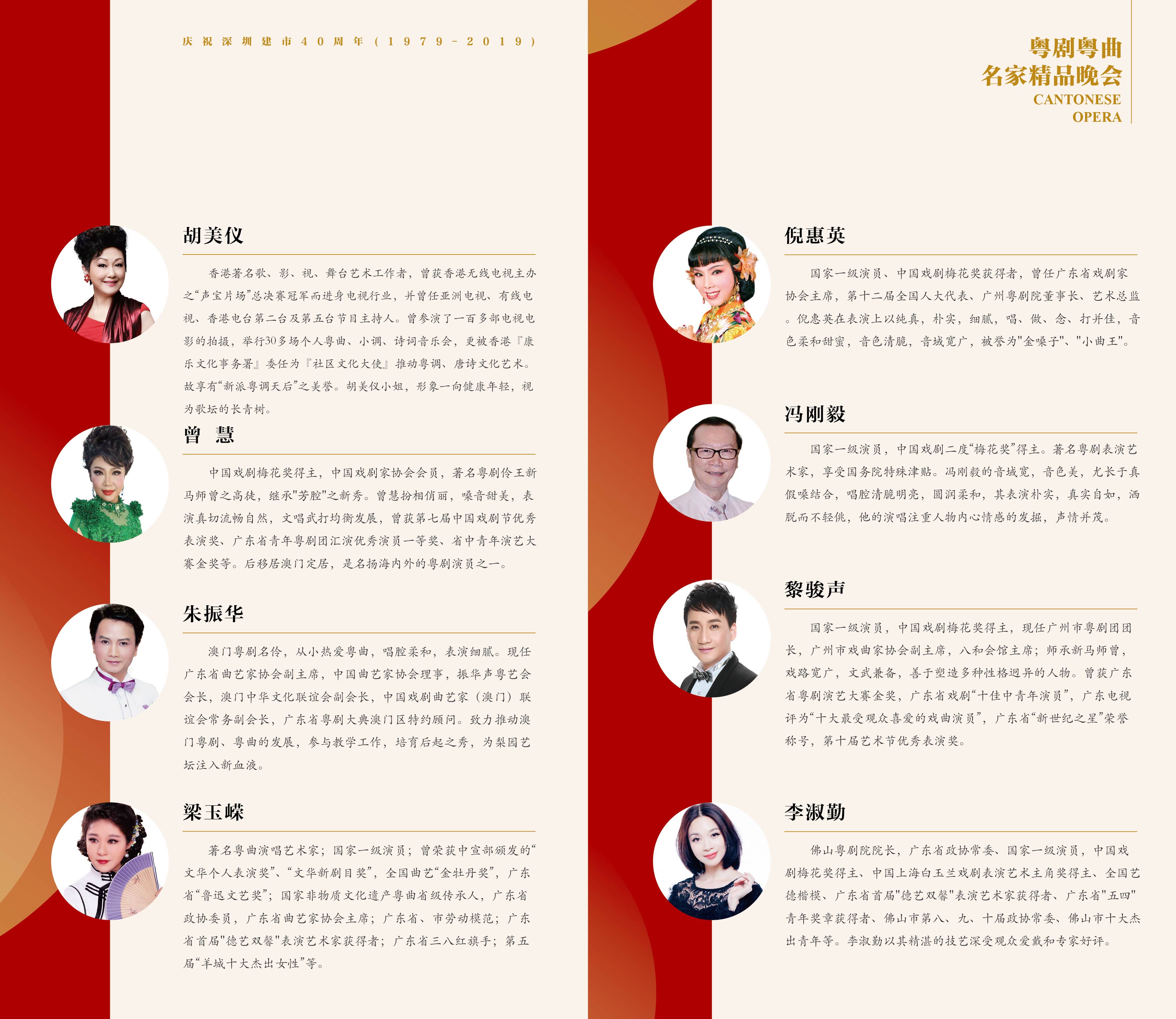 本次晚會上,深圳粵劇團的藝術(shù)家攜手多位粵、港、澳地區(qū)著名粵劇藝術(shù)家:胡美儀(香港)、曾慧(澳門)、朱振華(澳門)、倪惠英(廣州)、馮剛毅(深圳)、黎駿聲(廣州)、李淑勤(佛山)、卓佩麗(深圳)、黃偉坤(深圳)聯(lián)袂演出。其中,倪惠英、馮剛毅、黎駿聲、卓佩麗、李淑勤、歐凱明、曾慧為中國戲劇“梅花獎”獲得者,馮剛毅老師更是“二度梅”獲得者,可謂群星薈萃,名家云聚,為深圳打造粵劇“戲碼頭”增添了耀眼的光彩與活力。