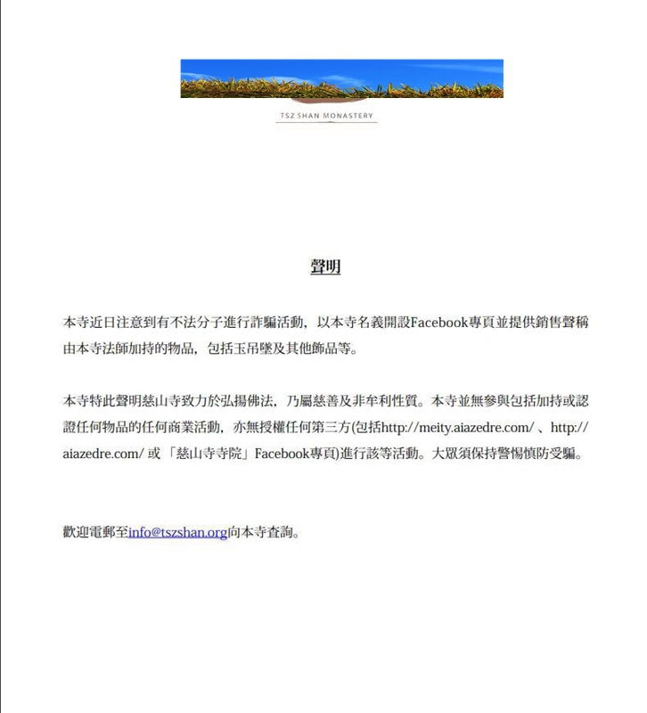 警方同時(shí)向深晚提供的證據(jù)中,還有一份香港某知名寺院的聲明。聲明中說(shuō):"本寺近日注意到有不法分子進(jìn)行詐騙活動(dòng),以本寺名義開(kāi)設(shè) Facebook專(zhuān)頁(yè)并提供銷(xiāo)售聲稱(chēng)由本寺法師加持的物品,包括玉吊墜及其他物品等。本寺特此聲明,本寺并無(wú)參與加持或認(rèn)證任何物品的任何商業(yè)活動(dòng),亦無(wú)授權(quán)任何第三方進(jìn)行該等活動(dòng)。大眾須保持警惕慎防受騙。"