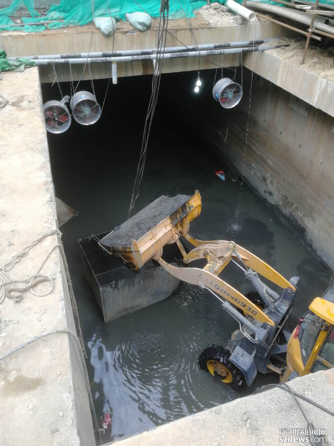 作為整個項目兩處開口之一,皇崗中學(xué)旁這片工地只有400平方米,很多大型設(shè)備無法施展開來。記者在現(xiàn)場看到,厚重的淤泥堆積有半人高,可見地下淤積情況嚴重,但現(xiàn)場堆積的淤泥并沒有令人窒息的味道,現(xiàn)場通風(fēng)工作較為不錯。走近施工口記者發(fā)現(xiàn),多臺送風(fēng)機在不停歇地工作,抽水設(shè)施也在將暗渠的水抽出,確保渠內(nèi)積水在安全工作線內(nèi)。