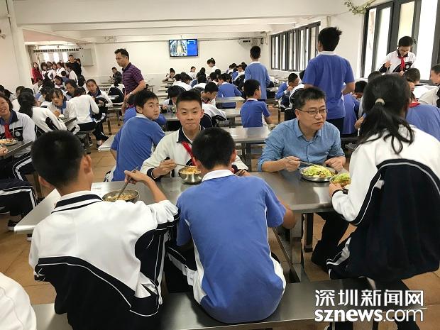 4月1日中午,深圳市福田區(qū)外國語學校校長丁長義跟學生一起在食堂就餐